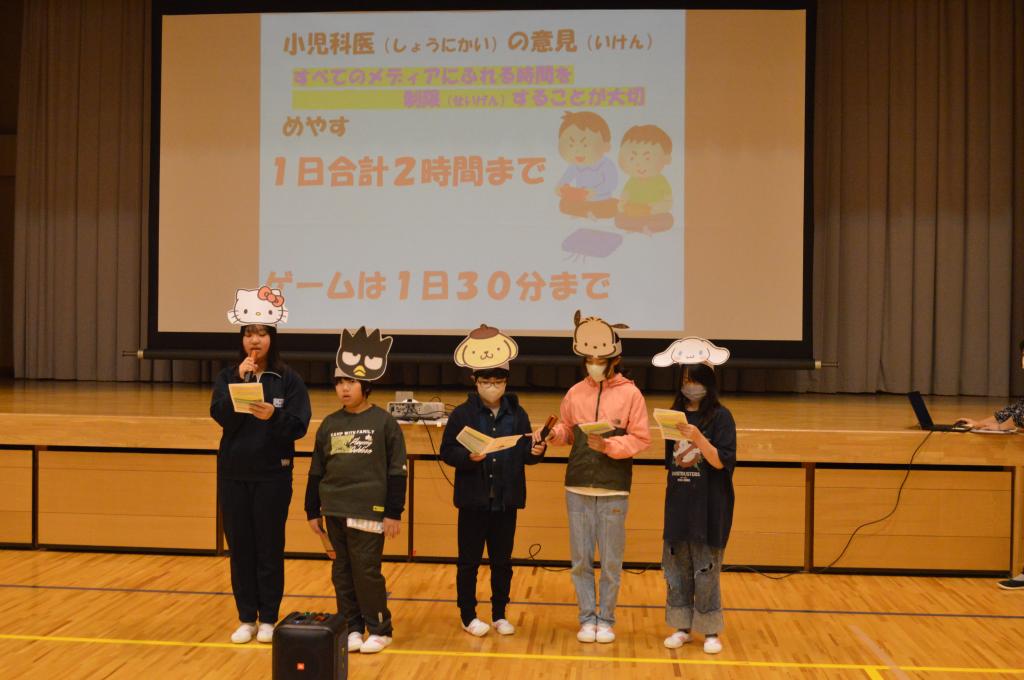 10月31日(金)、「メディアとうまくつきあい、体全体を使いげんきになろう」をテーマに、保健給食集会を開催しました。保健給食委員による発表と、縦割り班での楽しいゲームを通して、メディアとの付き合い方や体を動かす楽しさについて学びました。
