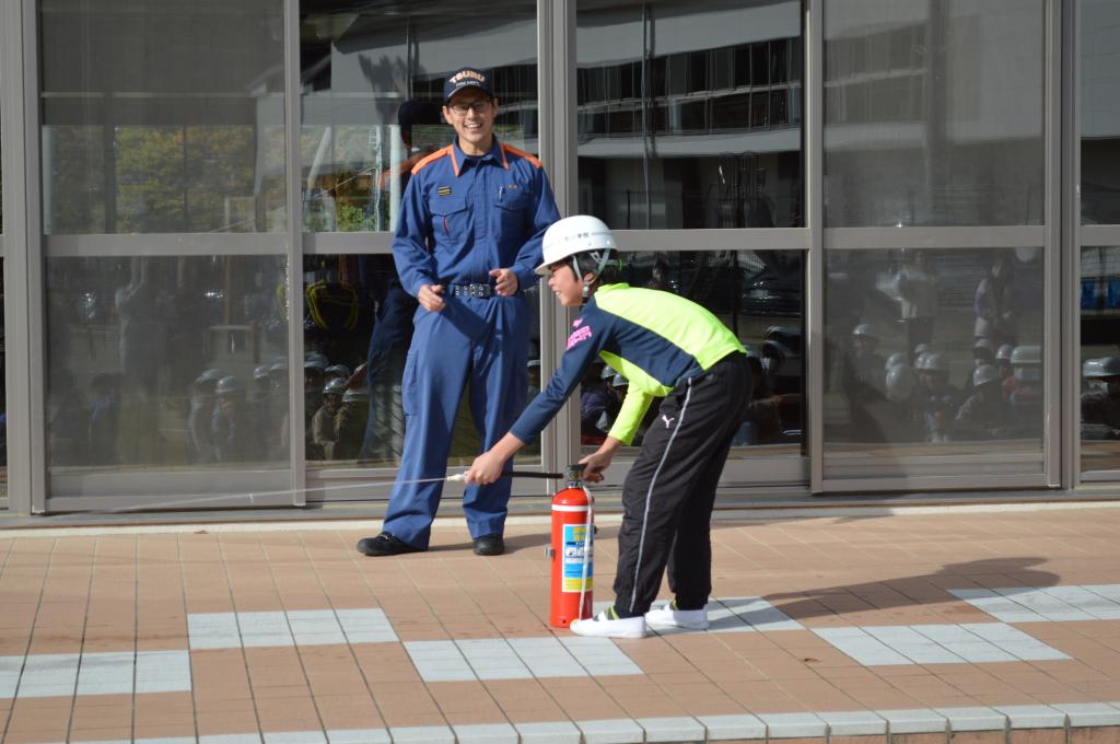 ✅ 実践的体験:消火器の正しい操作方法を代表児童が実践