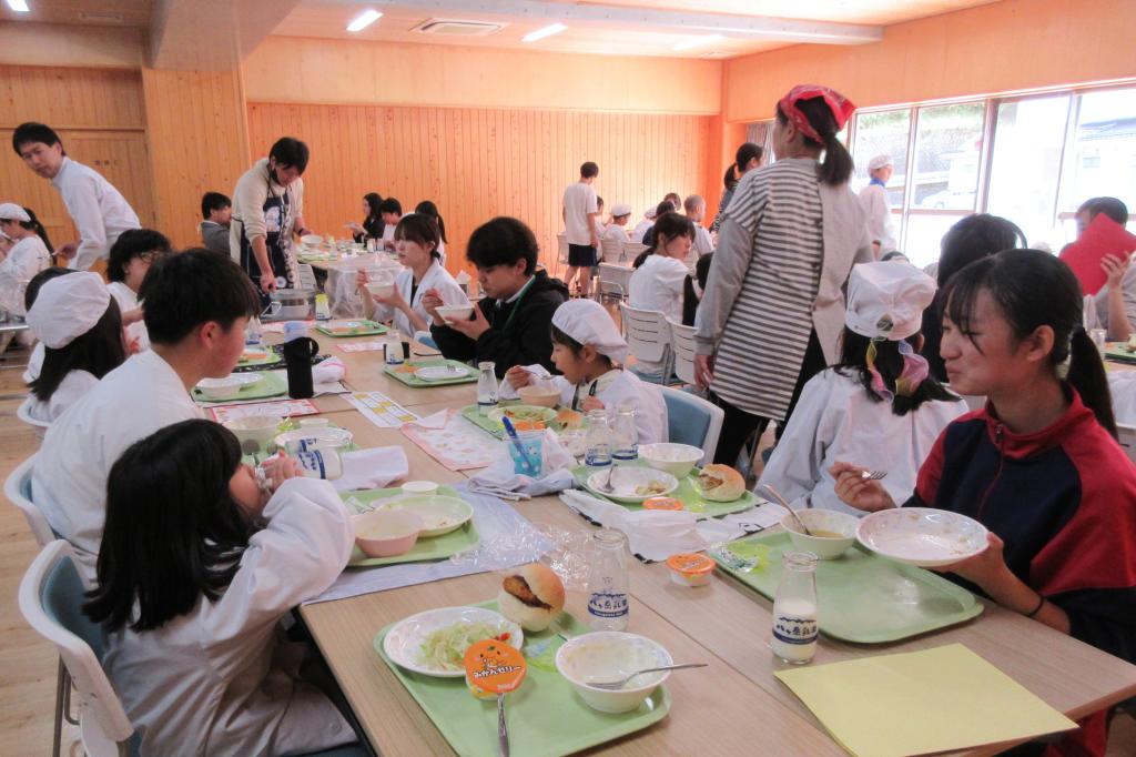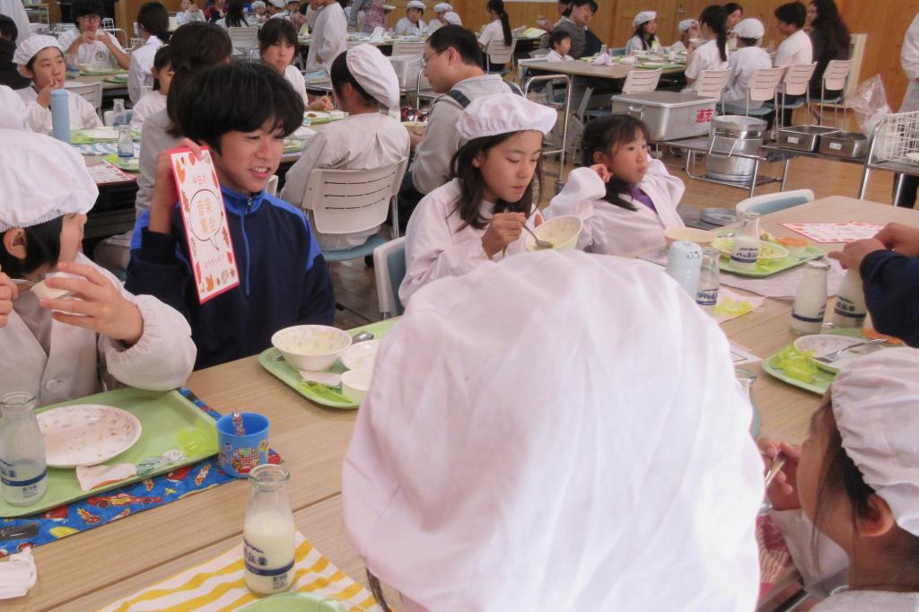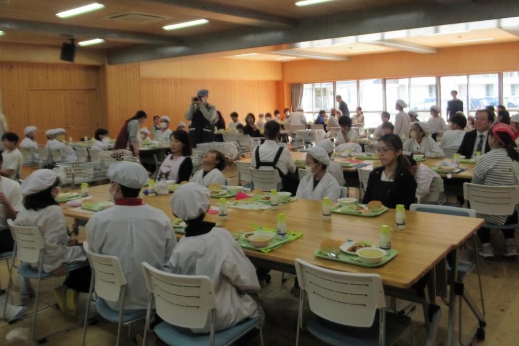 10月15日(水)、今日の給食は、小学生と中学生、そして先生方が一堂に会しての「小中交流給食」の日でした。いつもとってもおいしい給食なんですが、今日の給食は、おいしさに楽しさが加わって、格別でしたね。