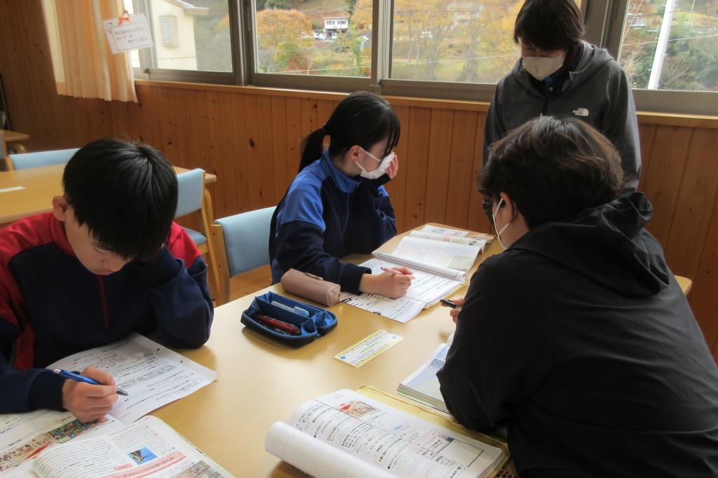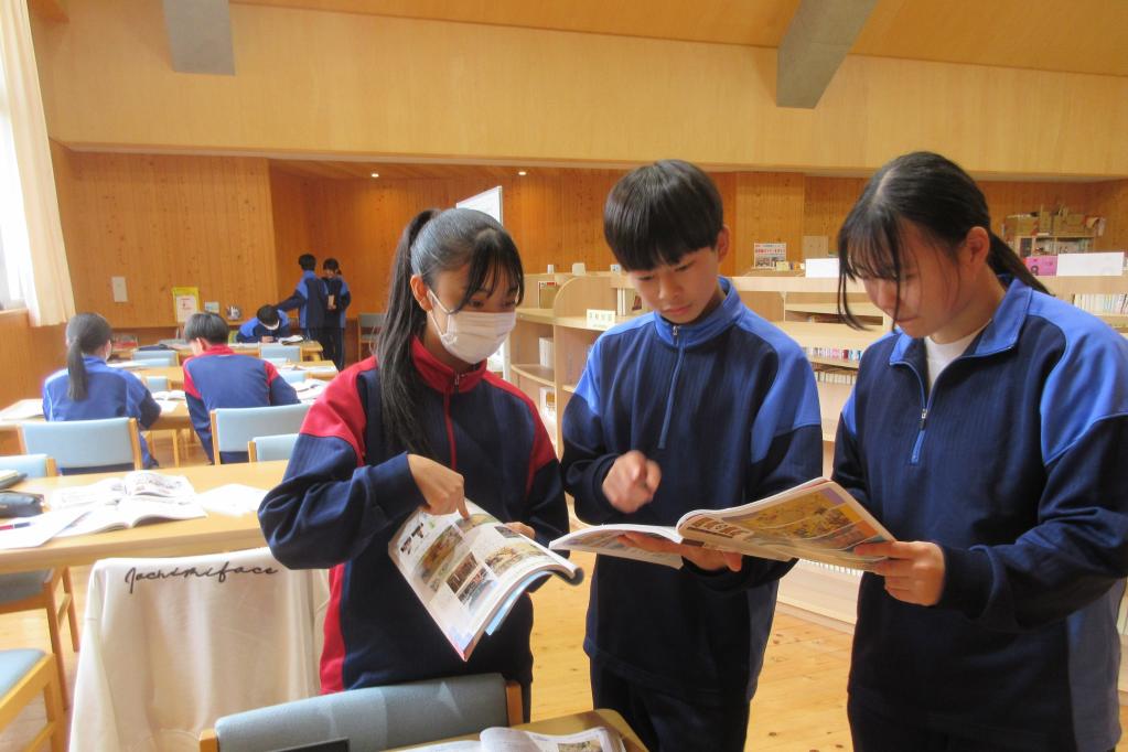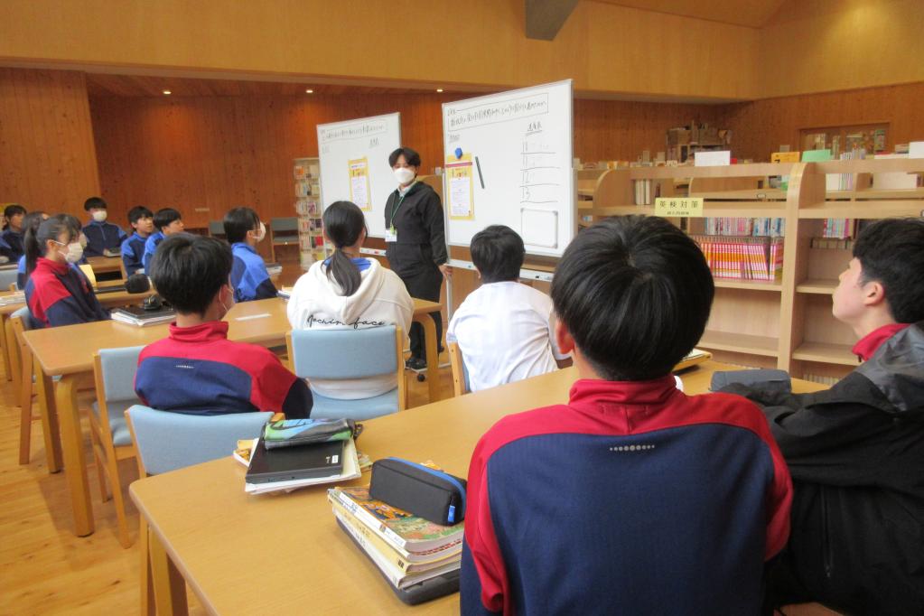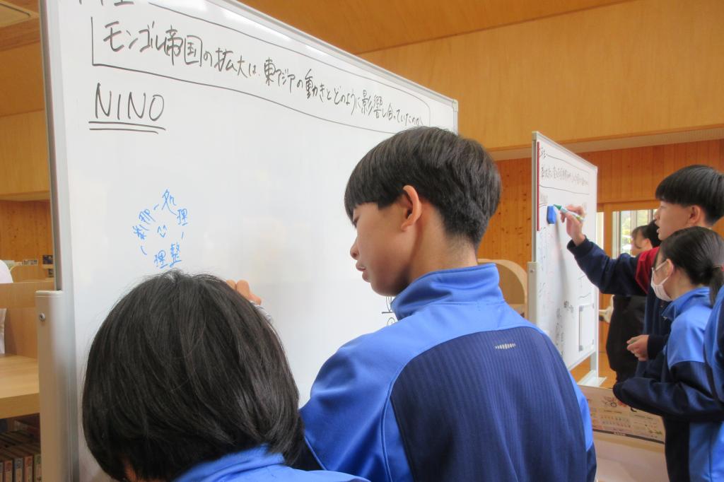 この日(11月18日)、1年生と2年生は、図書室を利用して、社会の授業を行いました。本校では、単元内自由進度学習を推進しています。本時のねらいは、学習方法の共有です。「個別」と「協働」のタイミング、学習環境に適した空間を、生徒自身が選択し、異学年間での学びの共有場面もあります。