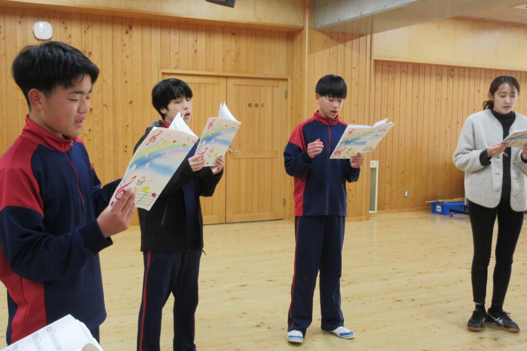 1・2年生が、合唱曲「虹」(石崎ひゅーい 作詞・作曲)の練習を進めています。 今年度は先生方も加わり、生徒と教職員の歌声が重なり合う、あたたかな雰囲気の中で取り組んでいます。「虹」には、前に進む勇気や仲間を思う気持ちが込められており、3年生への感謝と応援を伝えるのにぴったりの曲です。 1年生は「ありがとう」の気持ちをまっすぐに、2年生は尊敬と感謝を胸に、そして先生方も3年生の成長を見守ってきた思いを込めて歌っています。歌詞を大切にしながら声を合わせる姿が印象的で、3年生にとって心に残る時間となるよう、気持ちを込めて練習を続けています。